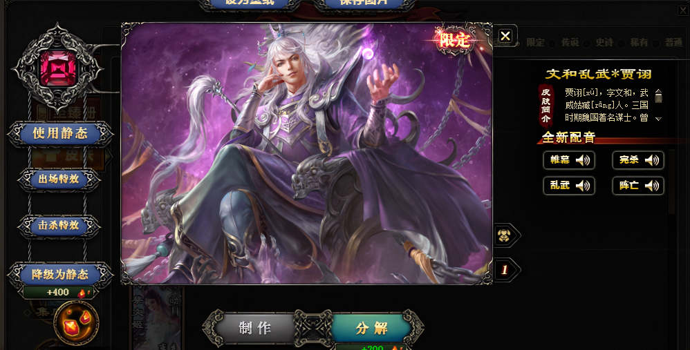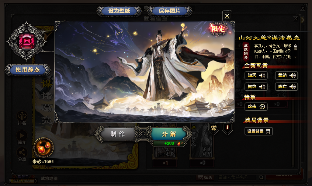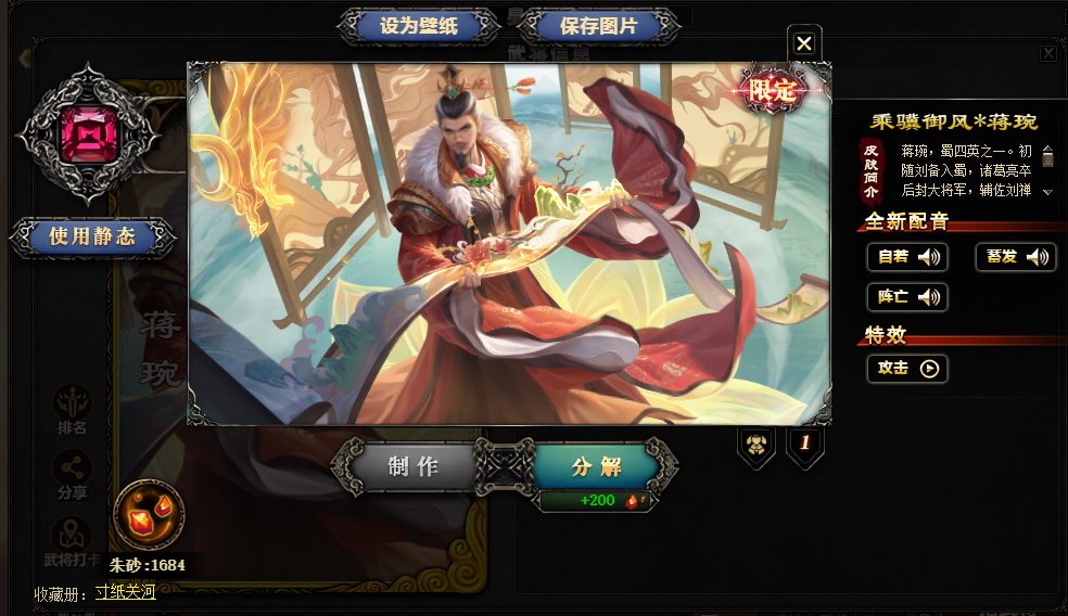 装备描述:谋诸葛亮 徐荣400节豪华动态 费祎蒋琬绘卷 魔貂蝉魔吕布魔司马懿张华谋华雄谋鲁肃sp刘备谋公孙瓒