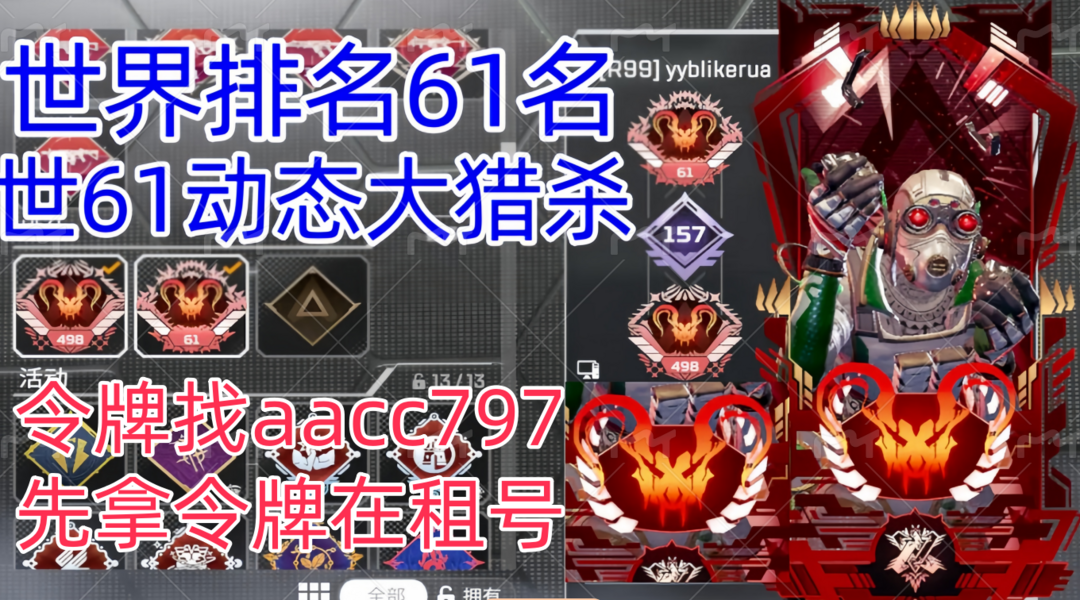 限制: 撤单率<70%才可租用此帐号装备描述:先拿令牌在租号,备用令牌在第一张图片上,人不在的话,租了也无法登录上,❤️请不要使用辅助和手柄,一旦使用手柄必封号❤️已在河南省郑州市律师事务所备案,描述太多,基本该满的都满了❤️--账号过于珍贵, 网吧用户租号前请在电脑.上面用小号玩1小时以上测试电脑是否存在机器码。有机器码账号会在1小时左右永久封禁。-----❤️世界61猎杀❤️26赛季61#动态猎杀❤️27赛季498#静态猎杀❤️一通用传家宝:猛禽之爪❤️热门皮肤:最终飞行,外域雪崩,捍卫者