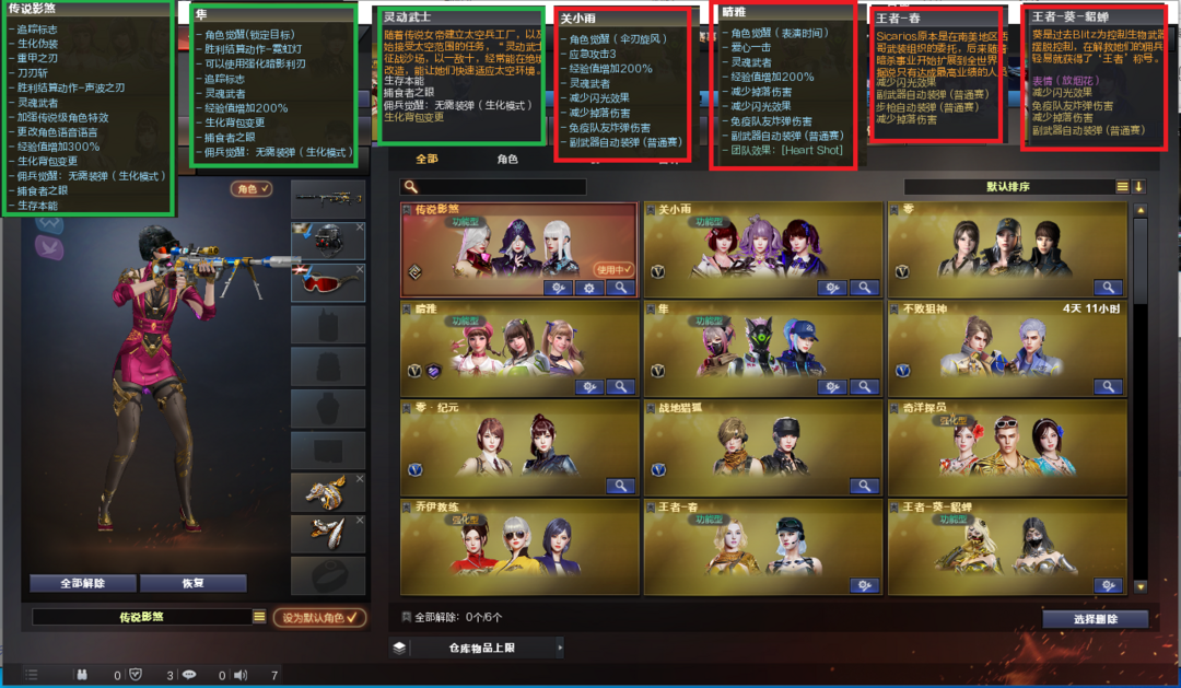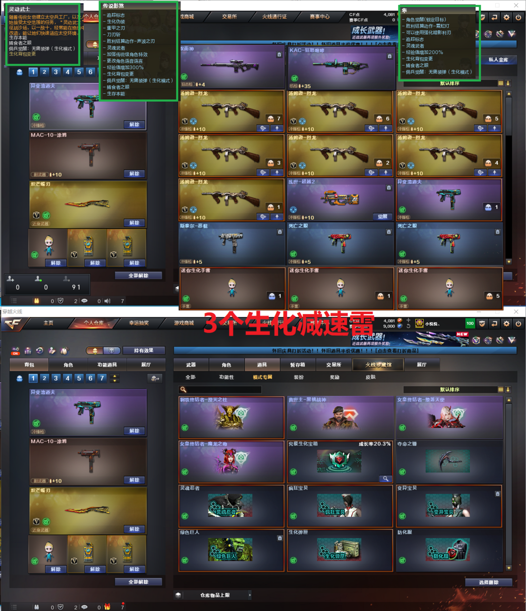装备描述:排位:可以-----------------生化四防极品(生化变更背包、查看血量):无需换弹、6烈龙、盘龙、异变清道夫、双面神、KAC-狂怒咆哮、死亡之眼、MAC涂鸦、炽芒蝶刃、3个生化减速手雷、生化常用弹匣、、、、、、、、、、爆破四防:幻神8皮+音效(宠儿、曹操、冠军之幻、白鲨、AG、2022、黄忠、动感闪耀皮肤)、传说灵眸、传说幽瞳、M200-竞技荣光、王者幻神、98K星神、王者星神、王者风神、王者星霆、传说破晓、传说幽冥、USP雷暴、COP幻灵、柯尔特竞技荣光、3个无冕之王、COP雷霆王者、冠军之特、FAMAS G2-天戎、G36幻影、QBZ金色蔷薇、、、幻神音效、裁决音效、星神音效、蔷薇音效、白虎音效、雷神音效、毁灭音效、天罚音效、极光音效、火麒麟音效、黑骑士音效、、、1套堕天神、1套幻灵、4套竞技荣光、4套云龙、2套雷霆王者、、、生化四防(传说影煞、隼、灵动武士)爆破四防(关小雨、晴雅、王者春、王者貂蝉、王者凌霄、王者炫)