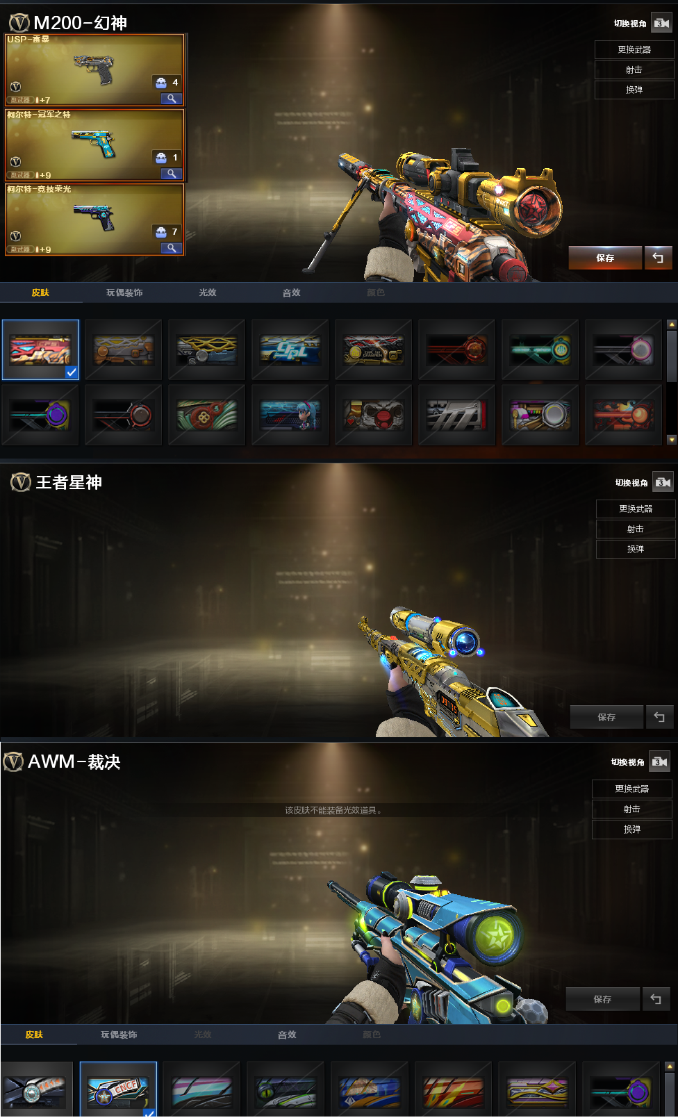 装备描述:排位:可以、、、、、、、、、、、、、、、、、爆破四防:幻神(2022皮肤)、王者星神、USP雷暴、冠军之特、柯尔特竞技荣光、、、、、传说梦魇、白虎、QBZ金色蔷薇、、、毁灭音效、火麒麟音效、黑骑士音效、、、1套雷霆、1套雷暴、3套竞技荣光、1套神工天巧、、、爆破四防(云悠悠、鹰、葵.赛.博.朋.克)