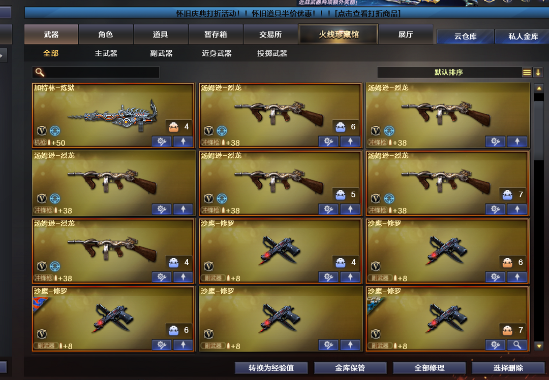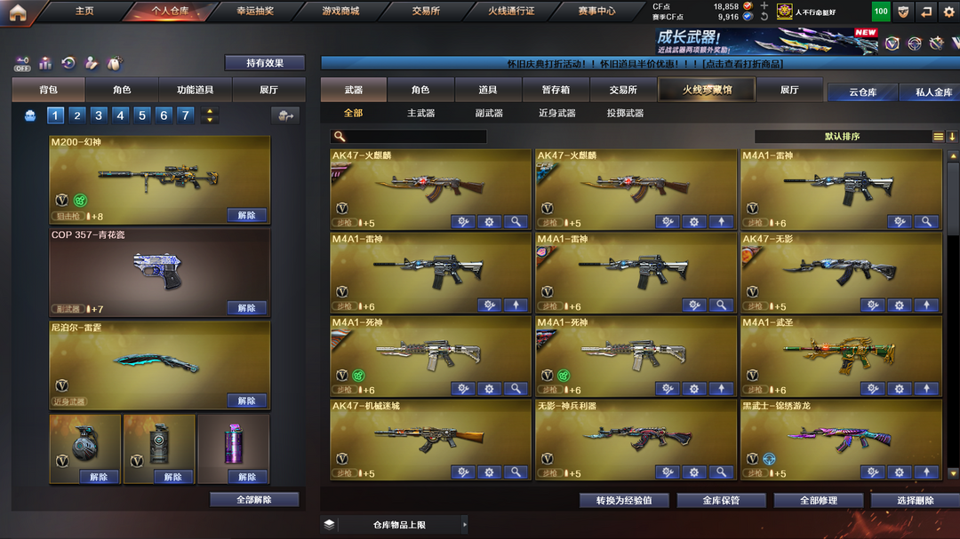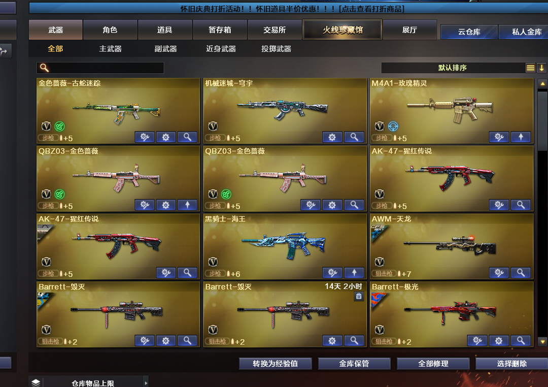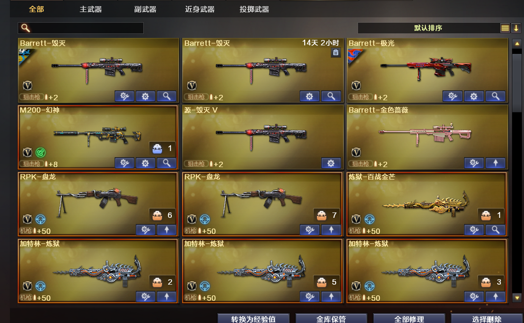 装备描述:英雄武器:Barrett-碧霄极光;Barrett-毁灭;机械迷城-穹宇;M4A1-雷神;RPK-盘龙;黑武士-锦绣游龙;无影-神兵利器;AK47-火麒麟;黑骑士-海王;斩神刀-雷暴;高爆手雷-雷暴;烟雾弹-雷暴;闪光弹-雷暴;AK-47-猩红传说;QBZ03-金色蔷薇;雷霆之锋;高爆手雷-雷霆;烟雾弹-雷霆;闪光弹-雷霆;M200-幻神;M4A1-死神;Barrett-极光;加特林-炼狱;沙鹰-修罗;汤姆逊-烈龙;屠龙;AK47-无影;擎天;龙啸;M4A1-武圣;M4A1-玫瑰精灵;AK47-机械迷城;Barrett-毁灭;AWM-天龙 角色:零;猎狐者;飞虎队;刀锋;潘多拉;幻影;雷霆-β;复仇者;堕天使;G.E.M.邓紫棋;夜玫瑰;威锋;陈龙野;陈龙野-Y;娜塔莎;救世复仇;救世主;精英部队;灵狐者;烈锋;影武者-X;救世主-X;蜀雪;潜龙队-X;陈龙野-Z;青霞仙子;妲己;白狼-X;娟娟;风暴女;麻雀;剑齿虎-X;圣诞潘多拉-X;代号:翼;猎狐者-Y;潘多拉-甜心教官;芳心审判者;毒蝎-X;风暴女;猎狐者-追月;维纳斯;电竞少女;游珑儿;秦师;夜玫瑰-宠粉;化蛇;刀锋-京韵;