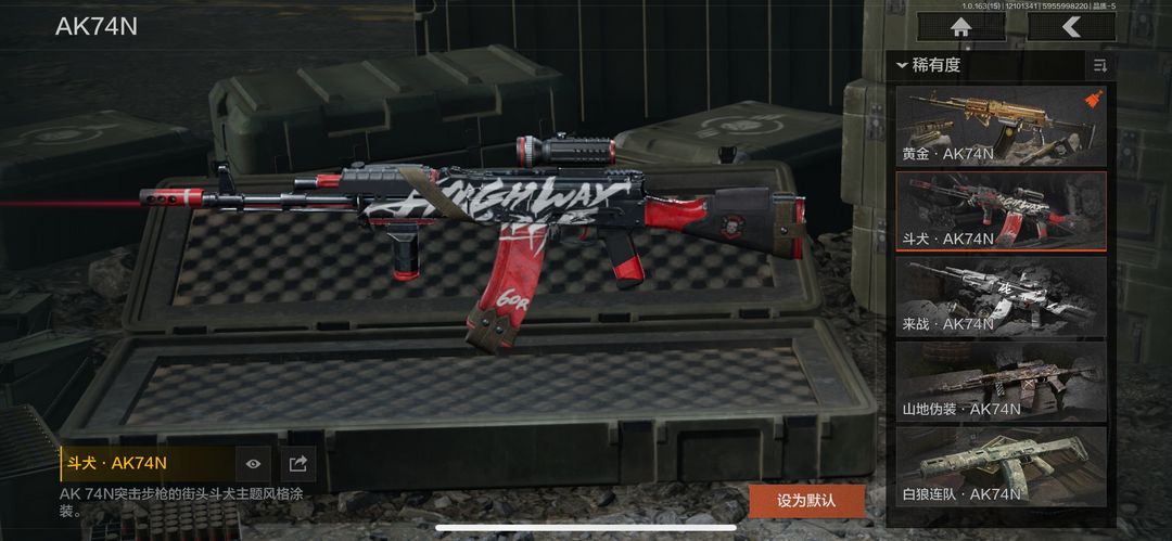 装备描述:30级,历史最高段位:暗区传说【近战武器】:胜利军刀,瑞兔折刀,下弦月,涂鸦利刃,明刀绣春,龙魂双节棍,冬日冰镐,裁决手杖剑,精英指虎,野战折刀,冰海战斧,鲨鱼刀,突击匕首,工兵铲,来战开山刀;【手套】:冬日手套,战术甲胄防护手套;【角色皮肤】:龙魂武术服,战术甲胄,机车朋克战衣,王国卫队礼装轻装,都市夜影套装,街区守卫;【突击步枪】:包络战术AKM,火力倾泻AKM,骑士之剑AKM,来战AKM,棱光裂变AKM,缟兵玄墨AKM,历战AKM,猩红抓痕AKM,潜渊蛇鳞M4A1,德尔塔小队M4A1,骤羽尖啸M4A1,竞技M4A1,秋宴FAL,和平之手FAL,竞技FAL,突围FAL,历战FAL,自喷网格H416,蓝色咆哮H416,竞技MDR,玄墨披挂MDR,中国奇谭MDR,洞窟遗迹AK102,玄墨披挂AK102,鱼跃丹青AK102,斗犬AK74N,山地伪装AK74N,白狼连队AK74N,黄金AK74N,来战AK74N,最后防线AKS74U,白狼连队AKS74U,龙影AKS74U,战术大师AUG,火力倾泻AUG,醒目提示F2000,钢铁真理F2000,炎夏浪花AR57,无声暗月AR57,涂绘猎人A