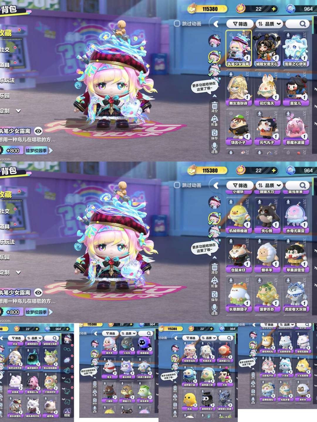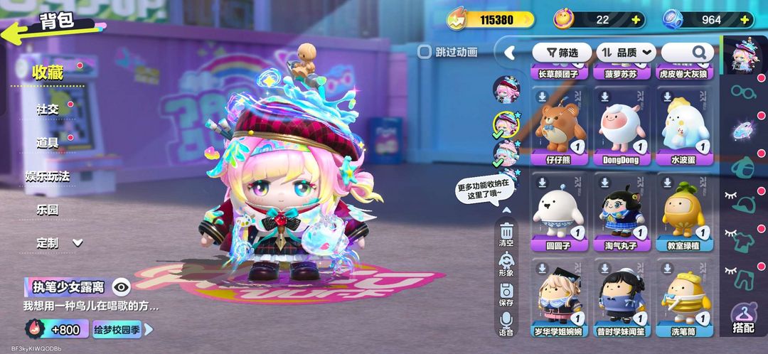 装备描述:懒羊羊,水波蛋,颜团子,dong羊,奶龙等联动皮,道具也比较多,图片可看部分皮肤,到时如没人租,可继续玩不会t下线