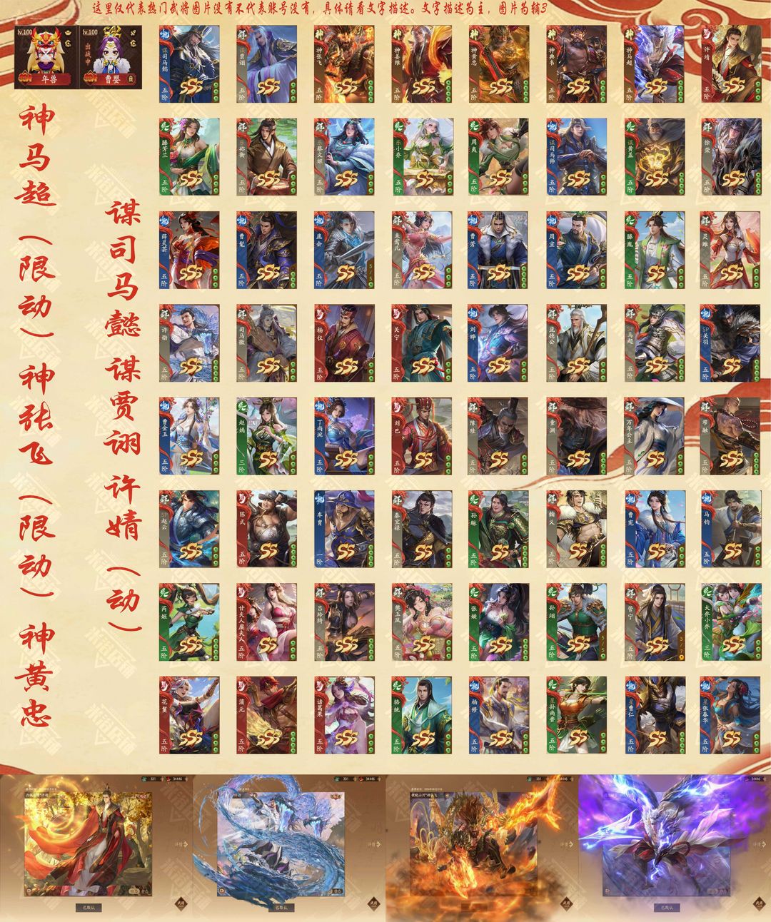 装备描述:乐祢衡 曹芳 许靖(限动) t兰芳 谋司马懿 谋贾诩 谋司马师 薛灵芸(限)周宣(传)丁妈(传) 甘糜夫人 刘晔(传) 曹宪 乐小乔(传) 星曹仁 星张春华 张璇 周夷(动) 吕玲绮(动) 孙翊 潘玉凤(传) 曹金鱼(秋千动) 关宁 管宁 骆驼 许邵(水龙动)全慧姐 徐荣 司马徽(限动)庞会 刘巴 孙綝 李丰 苒姬 陈式等