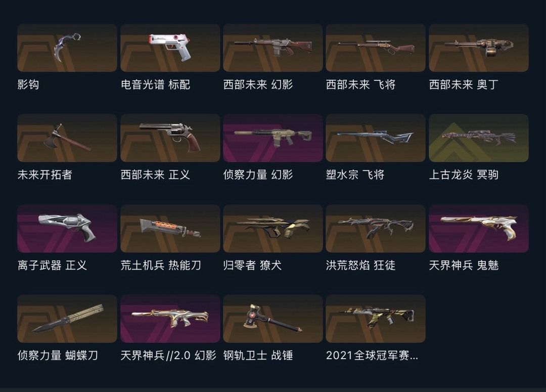 可排★21冠军掠夺爪刀影钩★洪荒狂徒★侦查幻影★蝴蝶刀★西部未来套装★电音光谱★天界鬼魅★塑水宗飞将