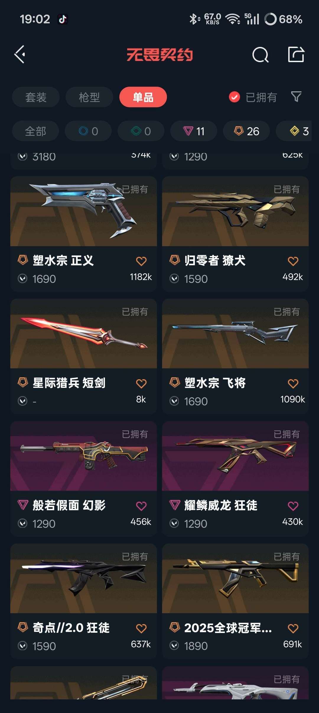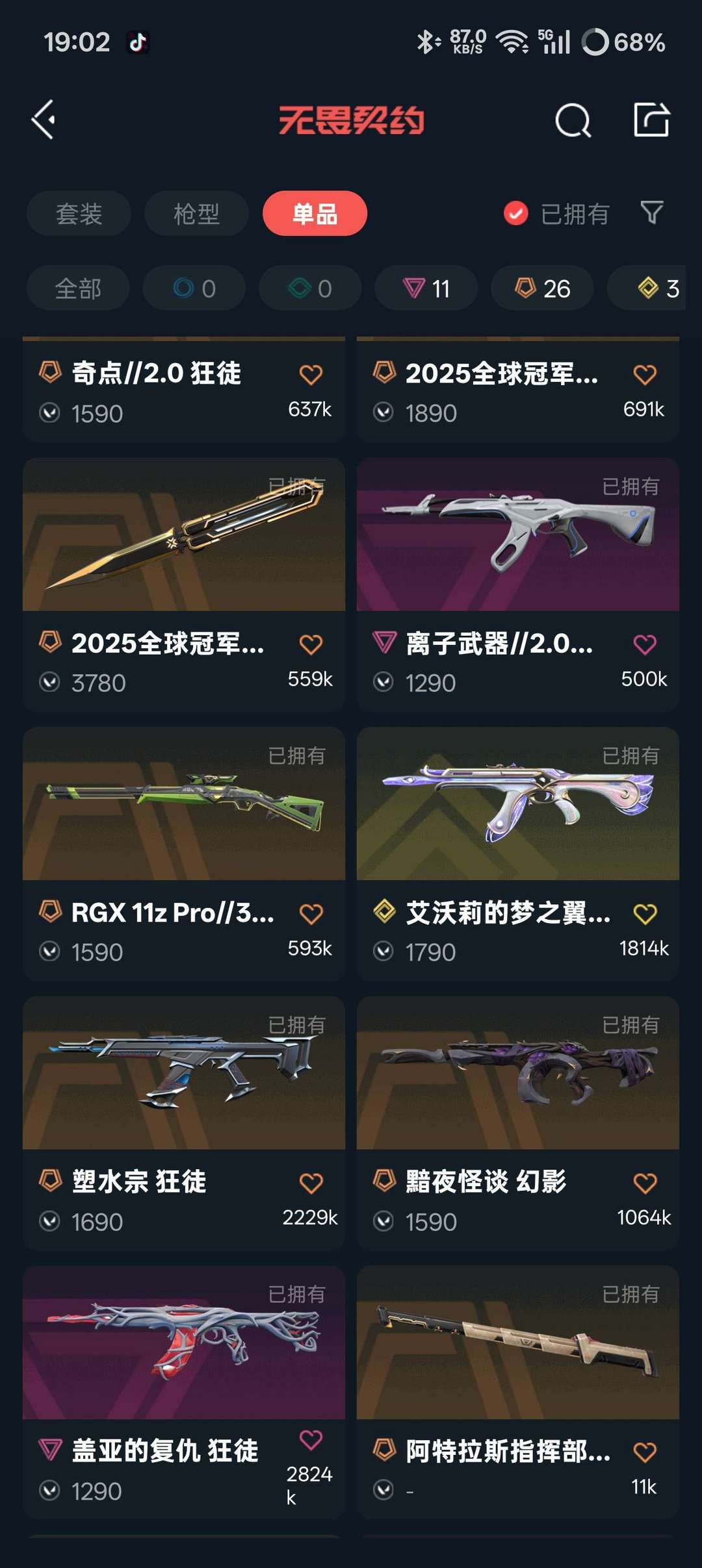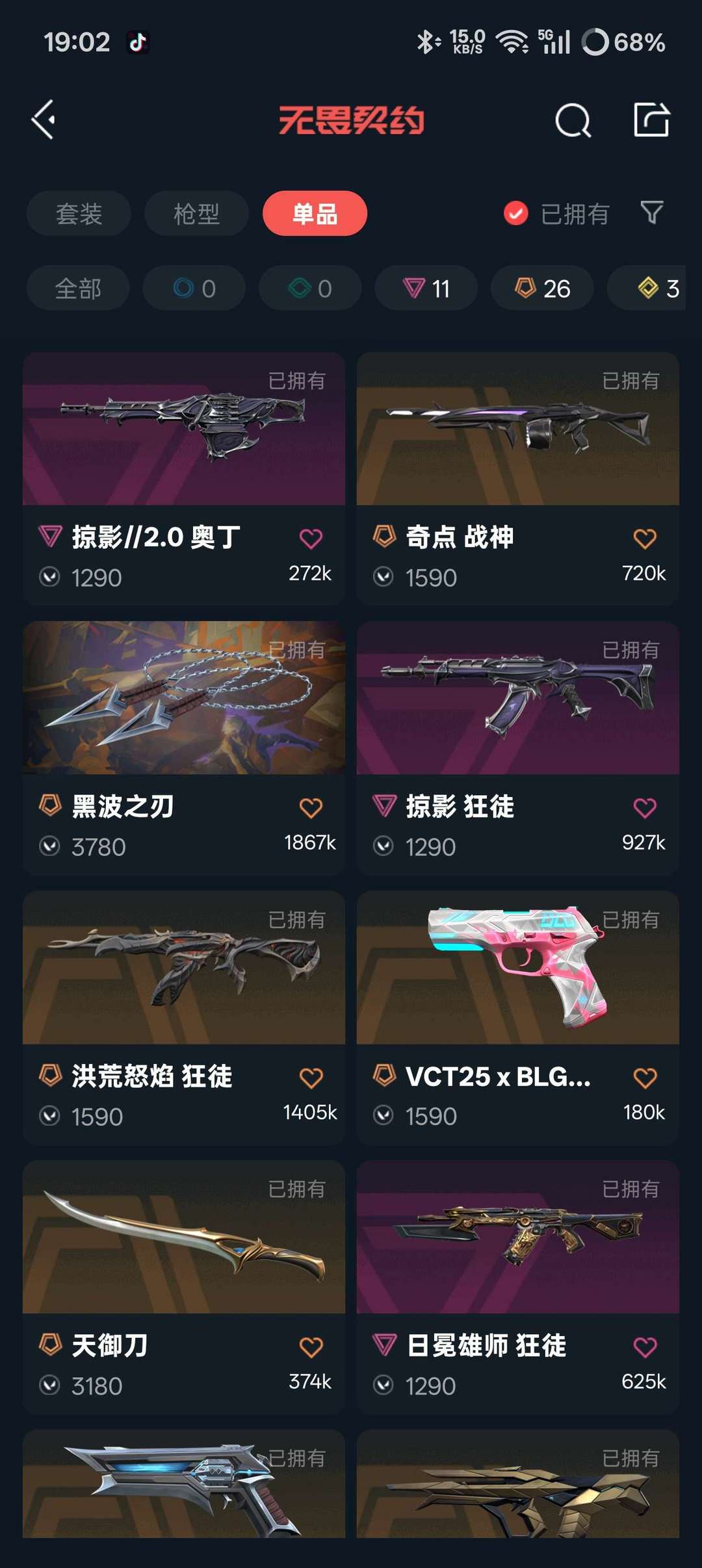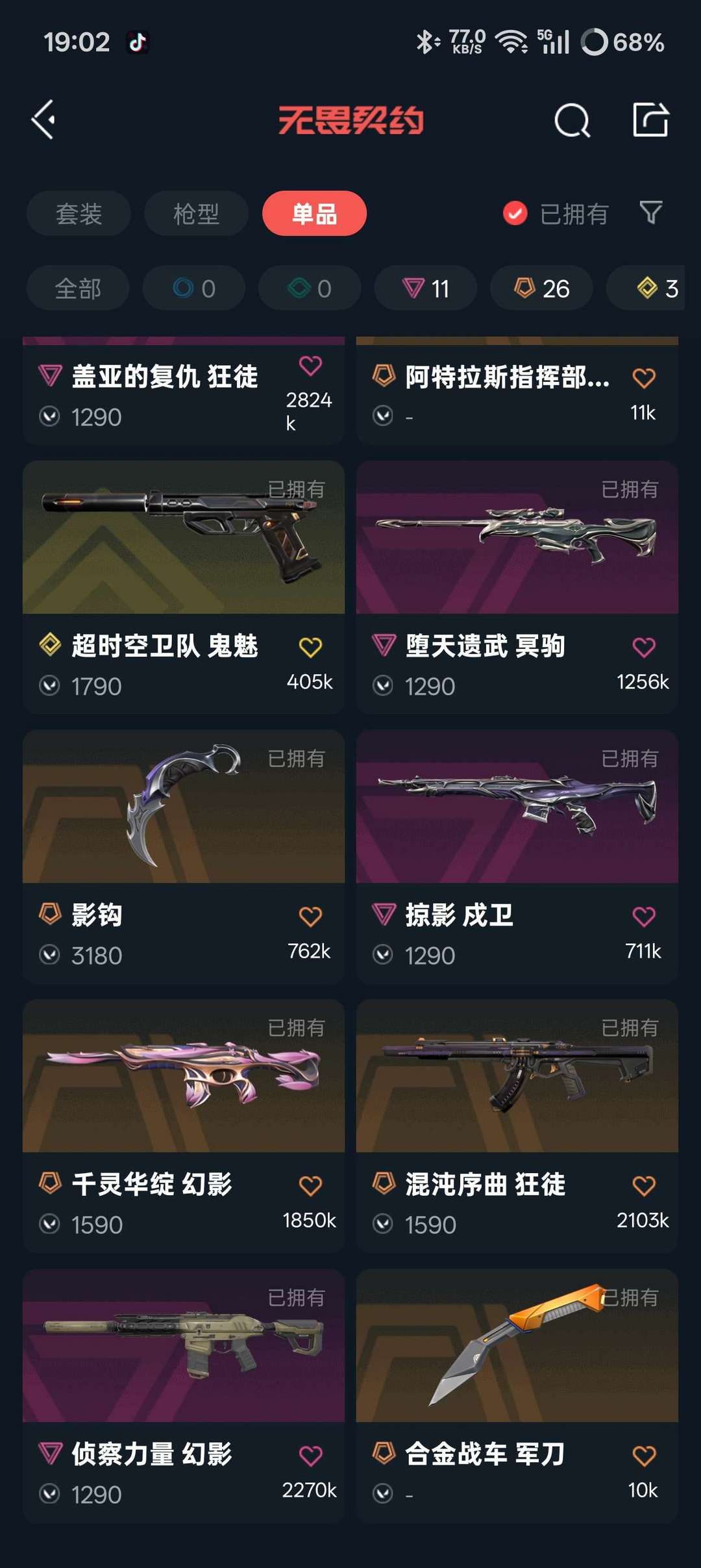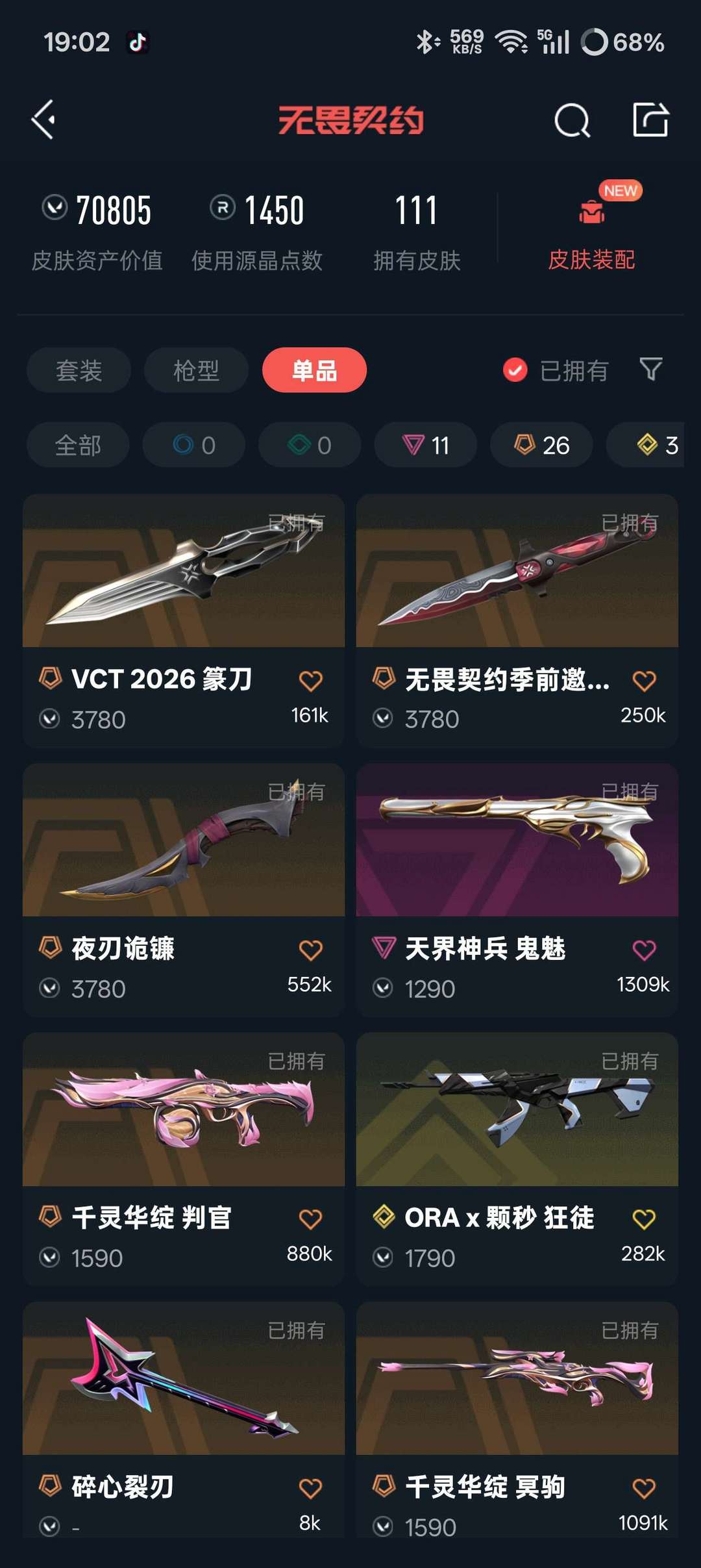 无畏契约全热门皮7w库存,vct26刀,黑波之刃,影勾,天御刀,25蝴蝶,夜刃诡镰,怜悯之刃。