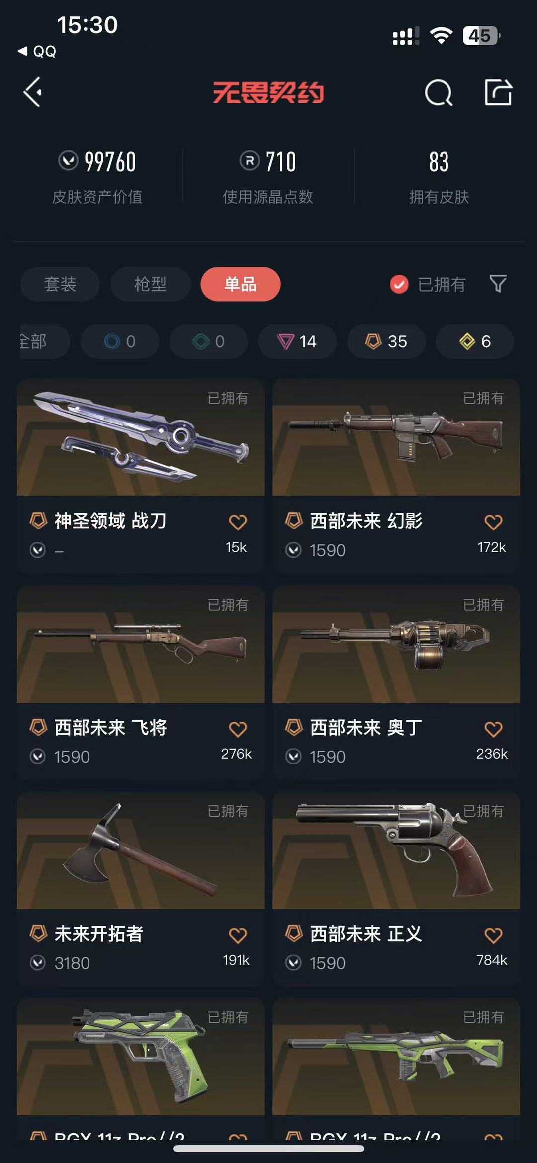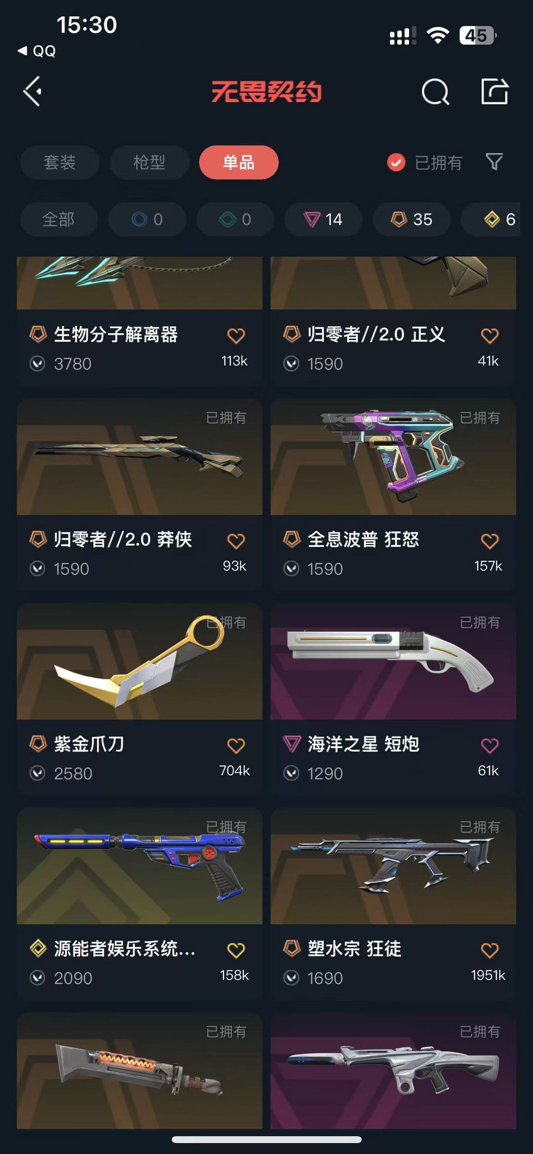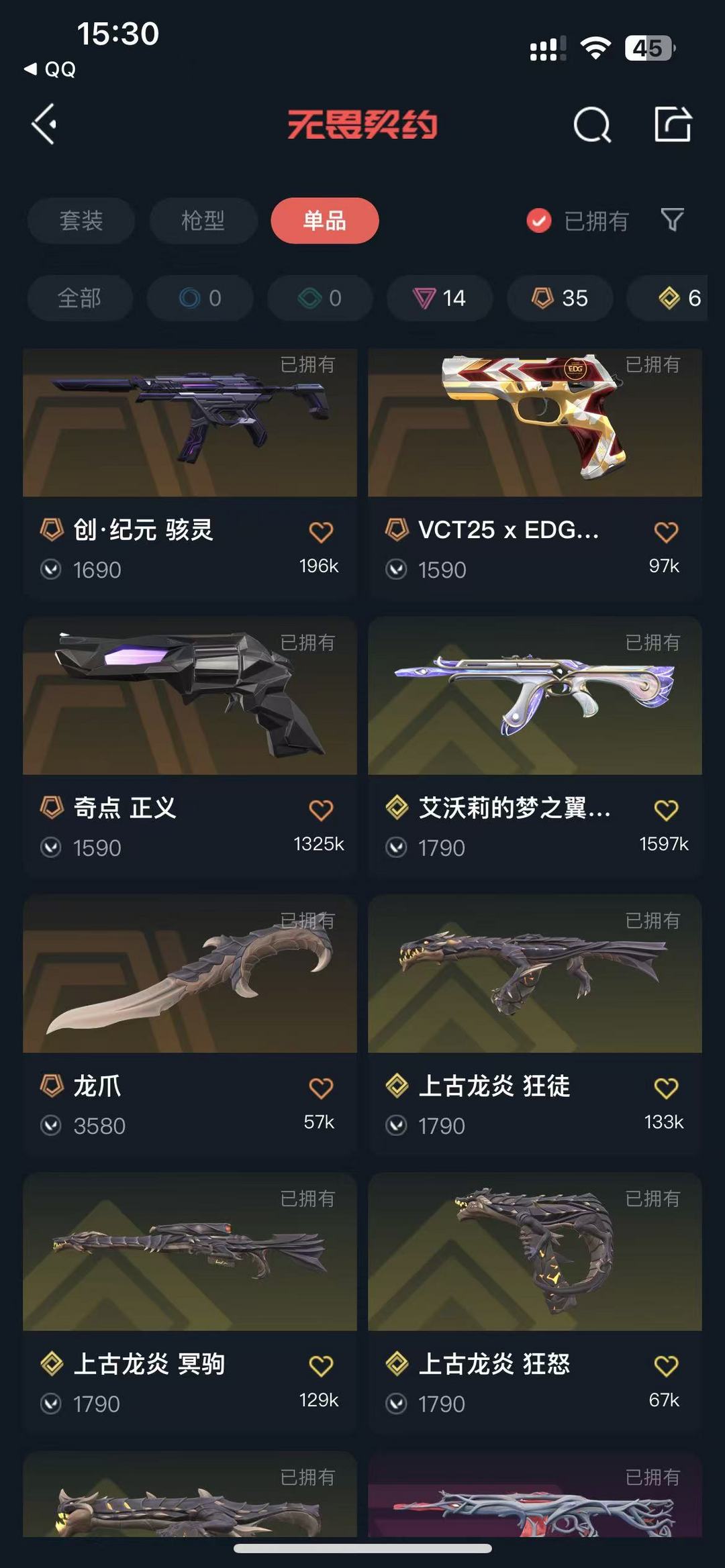15w库存♥双城套♥莲花套♥源能套♥上古龙炎套♥创纪元套♥VCT战队套♥太鬼鬼刀