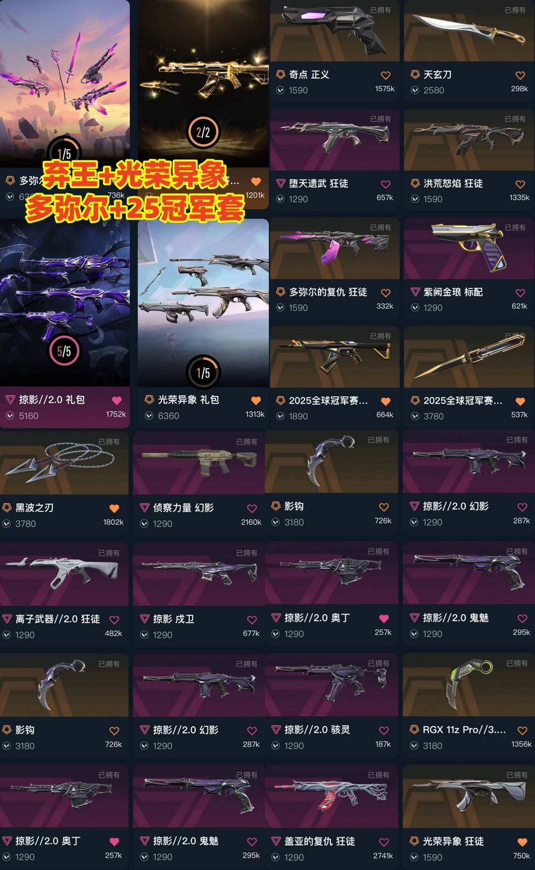 禁排✅精品库存⭐光荣异象多弥尔弃王洪荒25冠军套离子2盖亚⭐黑波之刃显卡爪影钩蝴蝶刀天玄刀⭐掠影侦