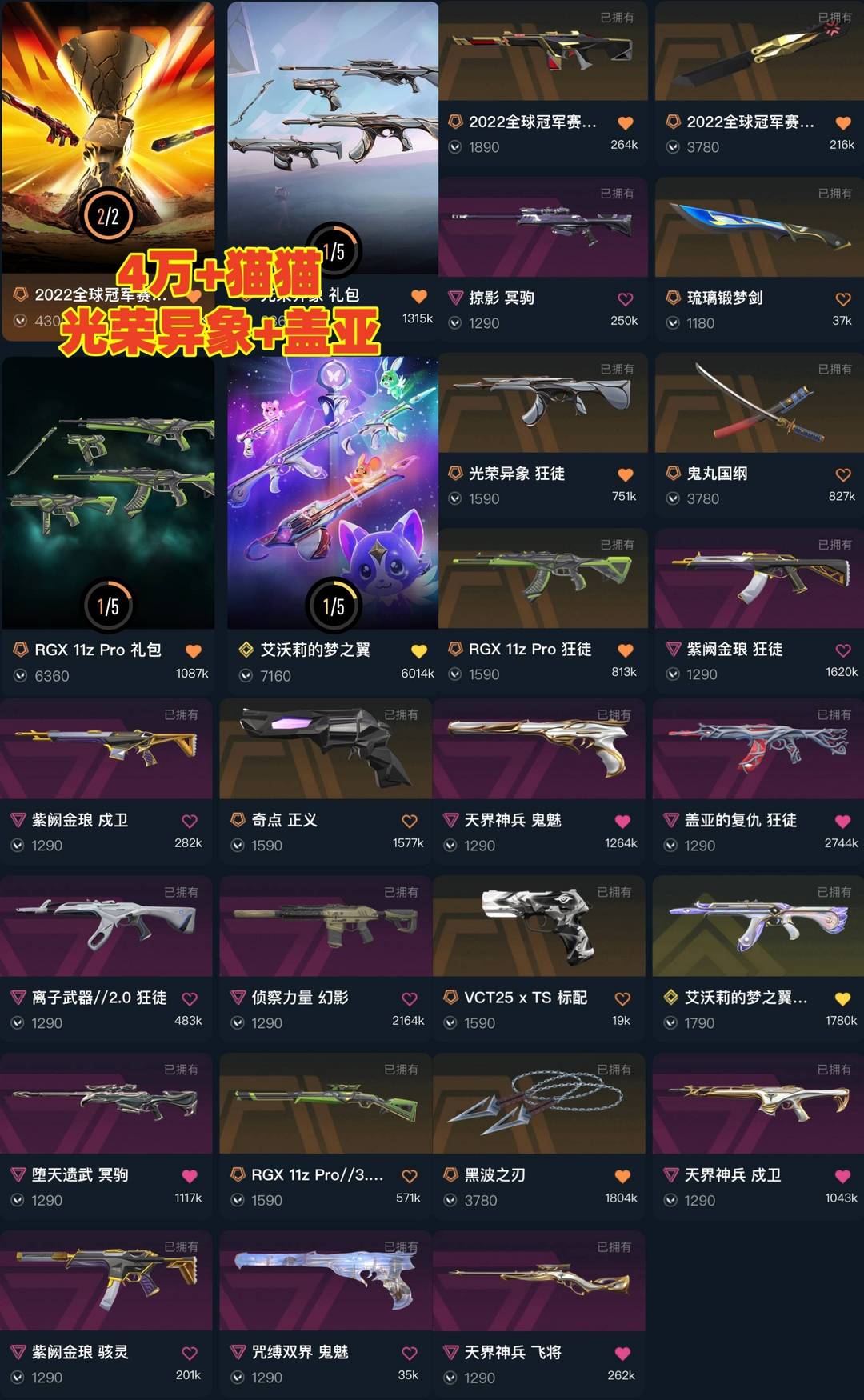 禁排✅4万⭐光荣异象显卡紫金离子2盖亚猫猫梦之翼⭐黑波之刃太刀蝴蝶刀⭐22冠军套侦察力量天界神兵奇