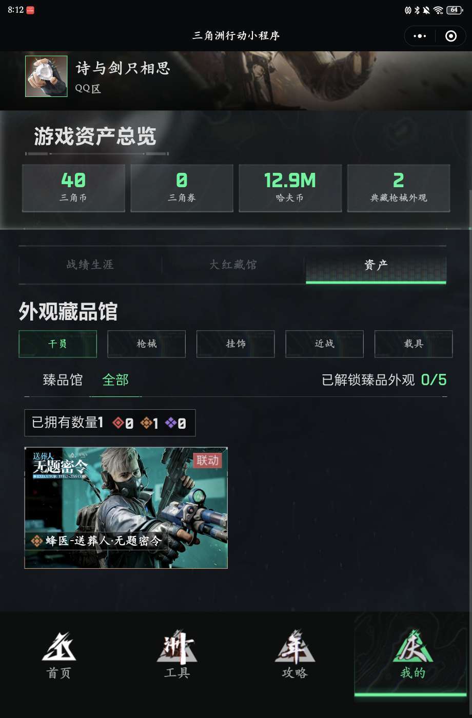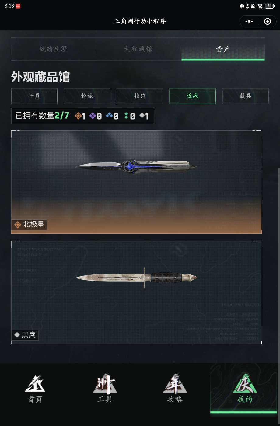 装备描述:北极星刀皮,无题密令峰医皮肤,多把金色品质枪皮