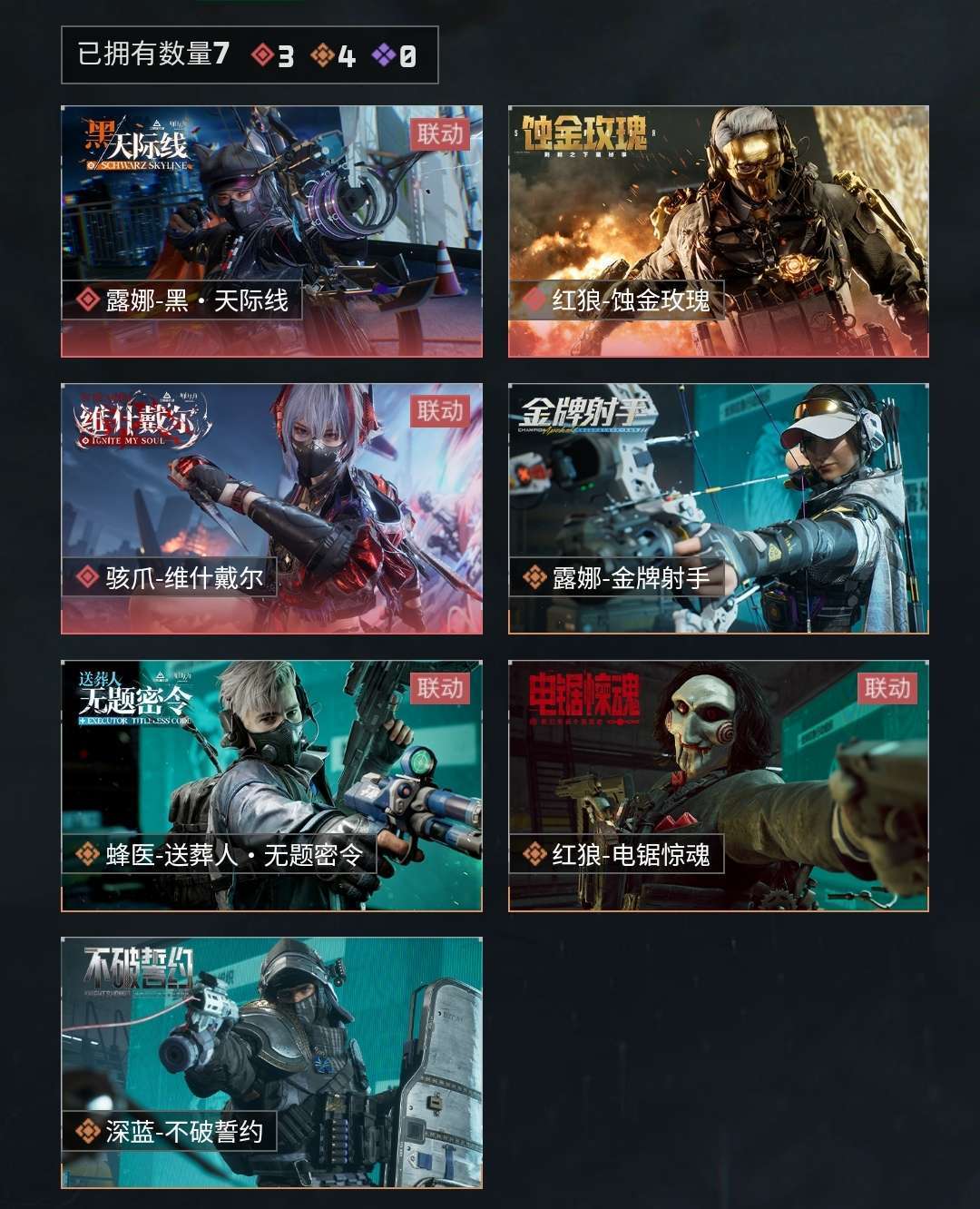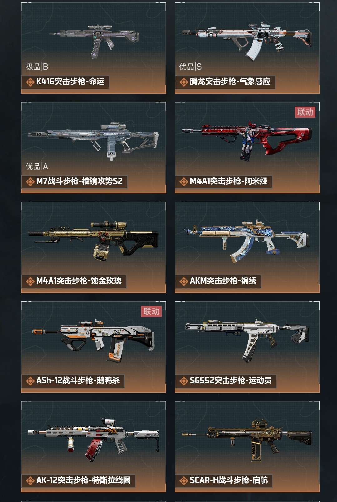 皮肤号 红狼蚀金玫瑰 近战武器-北极星 露娜黑天际线 K416突击步枪-命运 M7战斗步枪-棱镜攻势S2