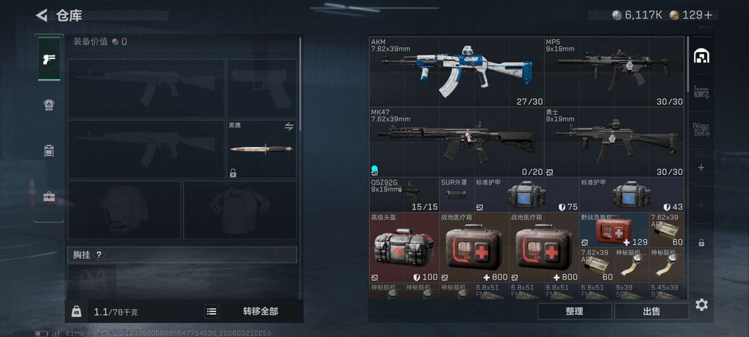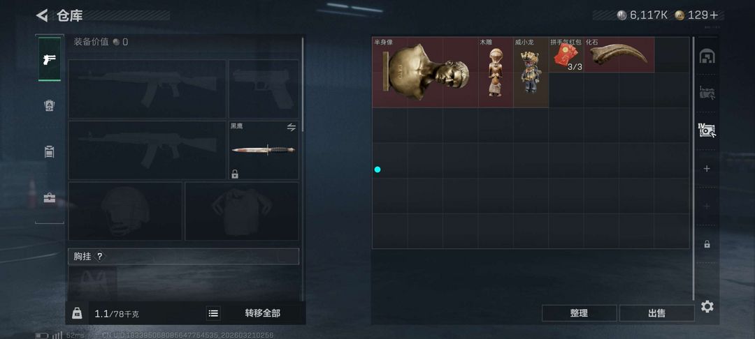 装备描述:6117K哈夫币,还有化石和半身像没买,加油吧,三角洲选手!