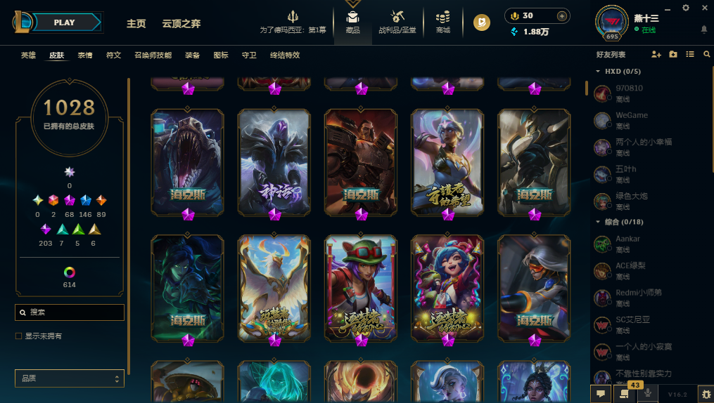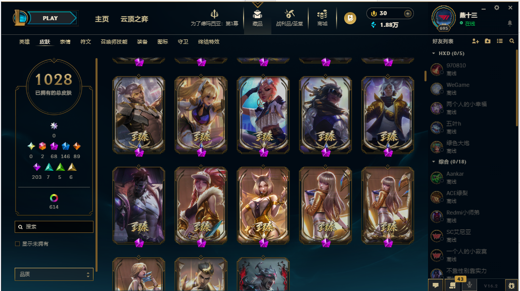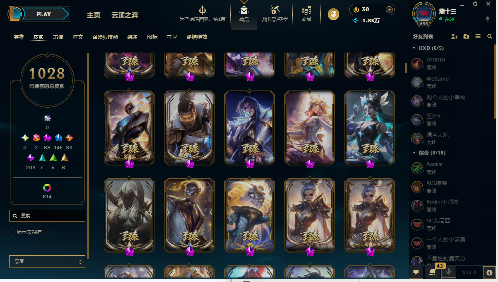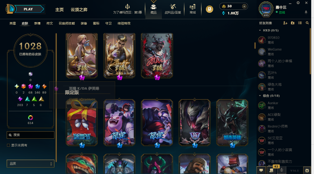 装备描述:【1642皮/可排位】1028原皮/614炫彩/41臻彩/全英雄