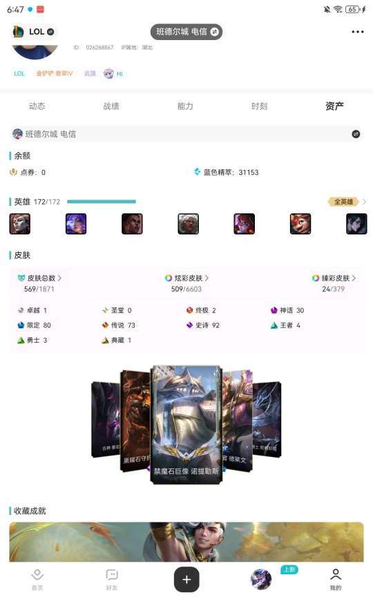 装备描述:569原皮(1卓越2终极30神话79限定73传说),249炫彩,23臻彩,全英雄。装备信息里面写的全,可以自己去看,我这边就不复制了
