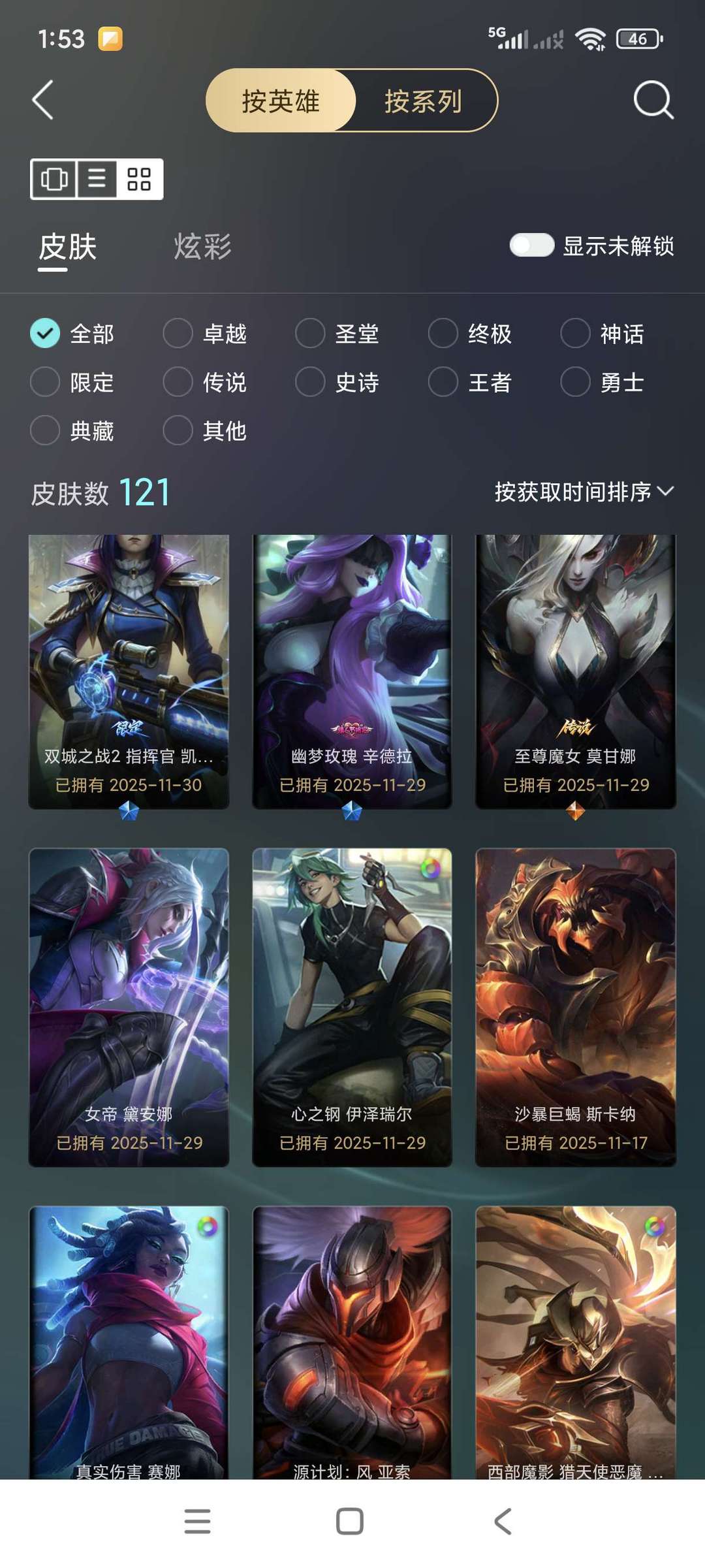 全英雄,121皮肤总数,皮肤不多但质量不差,段位不高可带妹炸鱼用。
