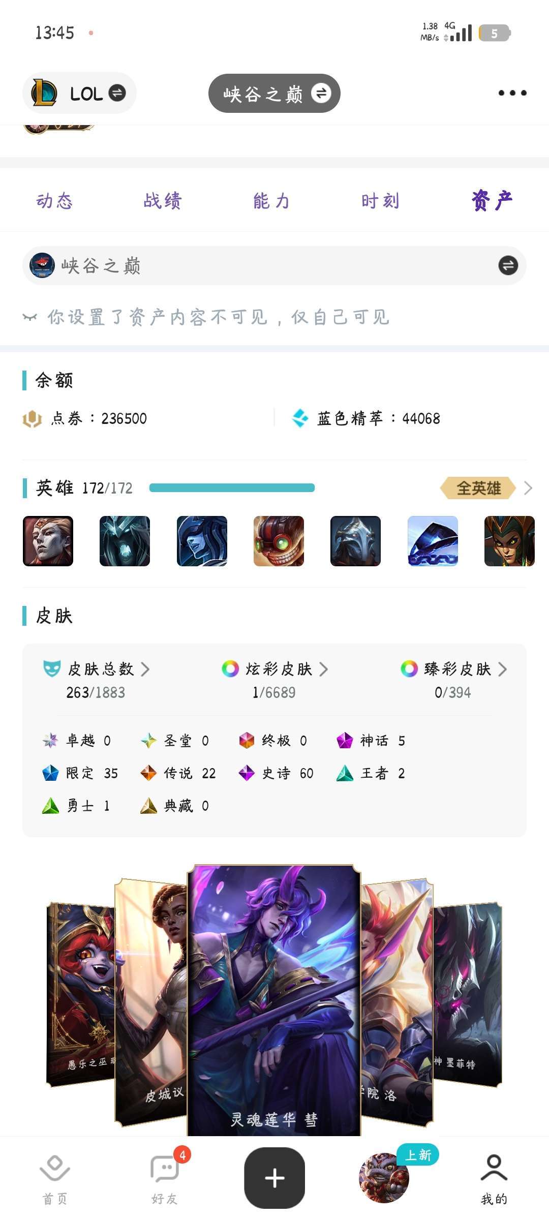装备描述:263个皮肤,还有点劵可以买,全英雄,别挂机别送人头