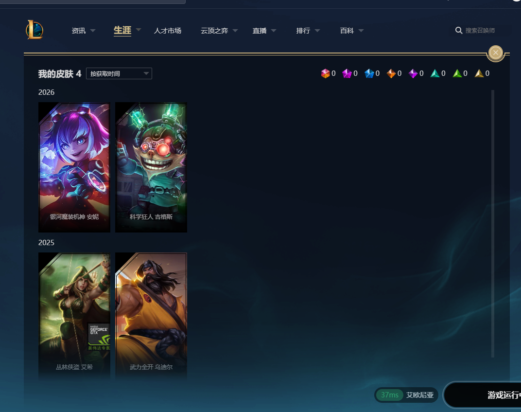 纯净账号0排位:科学狂人 吉格斯;武力全开 乌迪尔;丛林侠盗 艾希;银河魔装机神 安妮