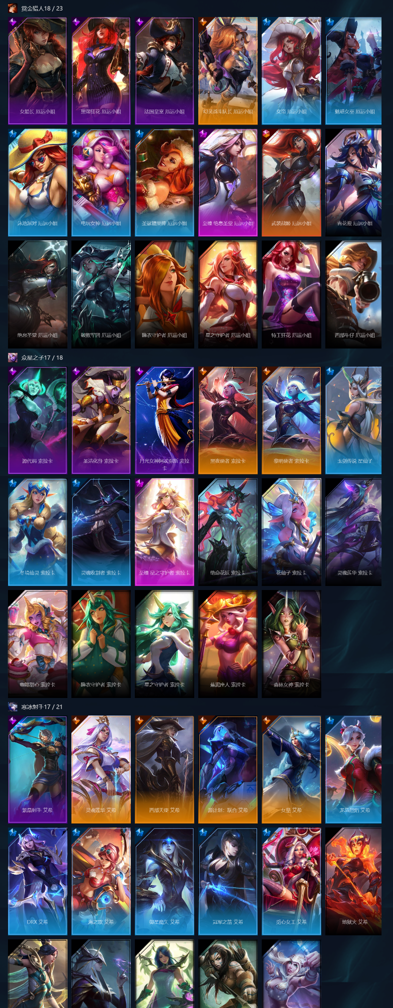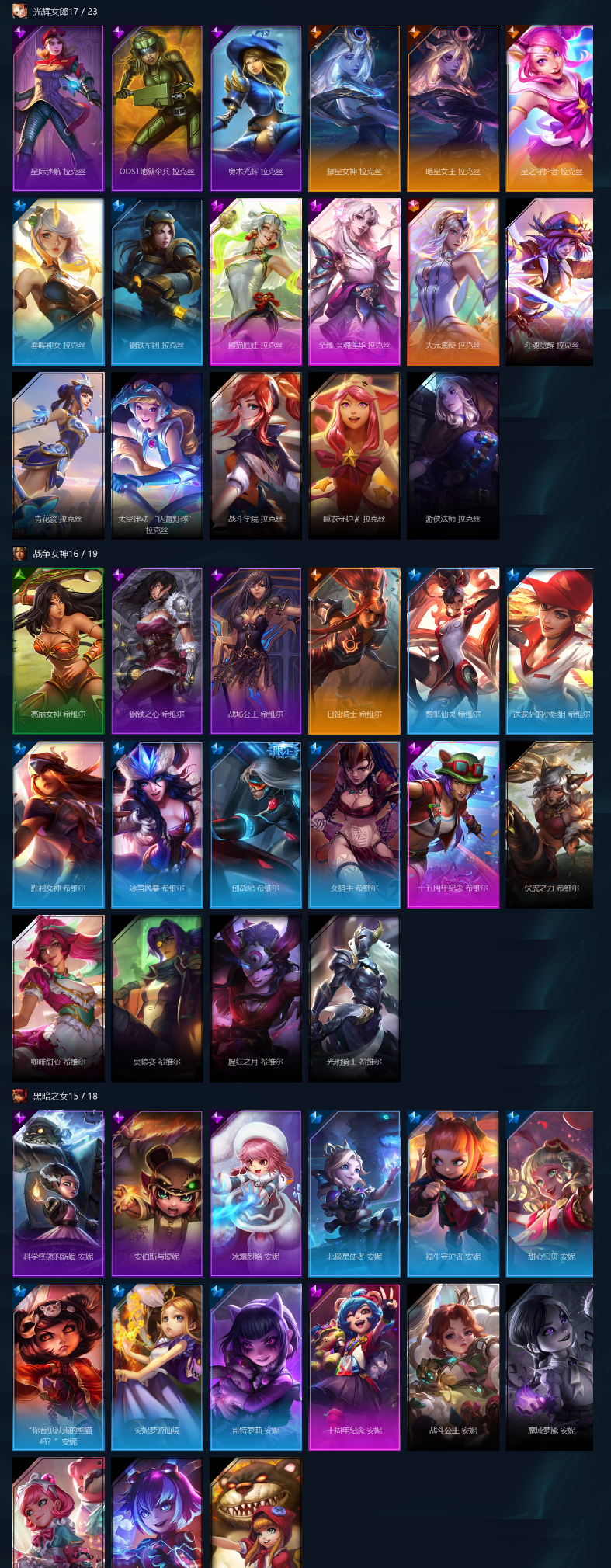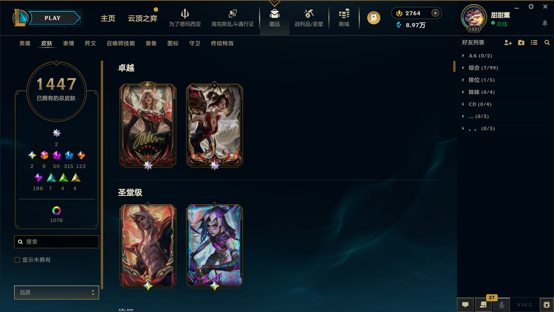 装备描述:总皮肤数量1450+名人堂阿狸签名版/软辅漂亮AD几乎全皮/臻彩80个/圣堂金克丝/圣堂瑟提/神话阿狸/神话娜美/灰烬派克/金鱼枫姬莲华温泉阿狸/沉溺暗影娜美/龙年琴女/冰雪节全皮/冰原狙击女警/钢铁军团拉克丝/哥特萝莉安妮/安妮梦游仙境/妹子号