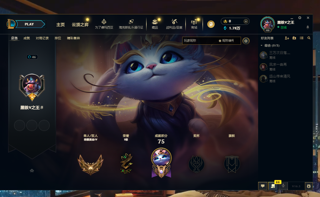 段位:46级 荣耀黄金IV级 荣耀黄金IV
