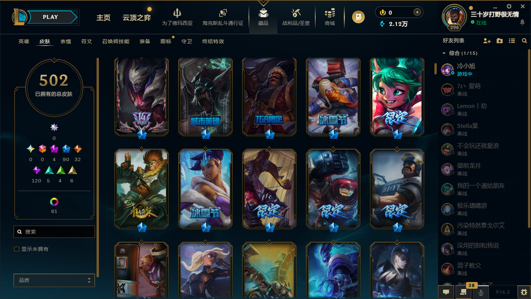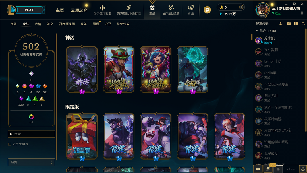 502皮肤,4神话,90限定,32传说,120史诗,龙猴,猴猴,奥斯曼大帝蛮王