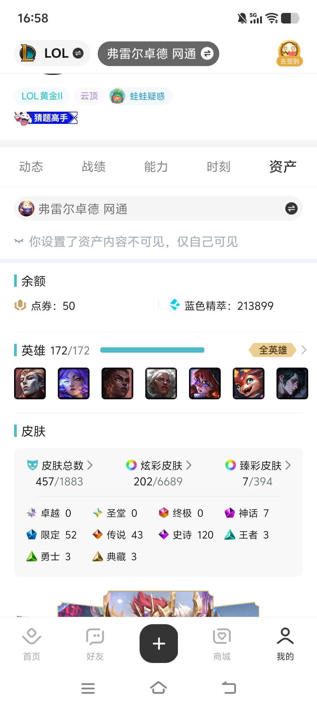 装备描述:全英雄,450+皮肤,200+炫彩,7个臻彩皮肤,欢迎各位老板下单支持~~~