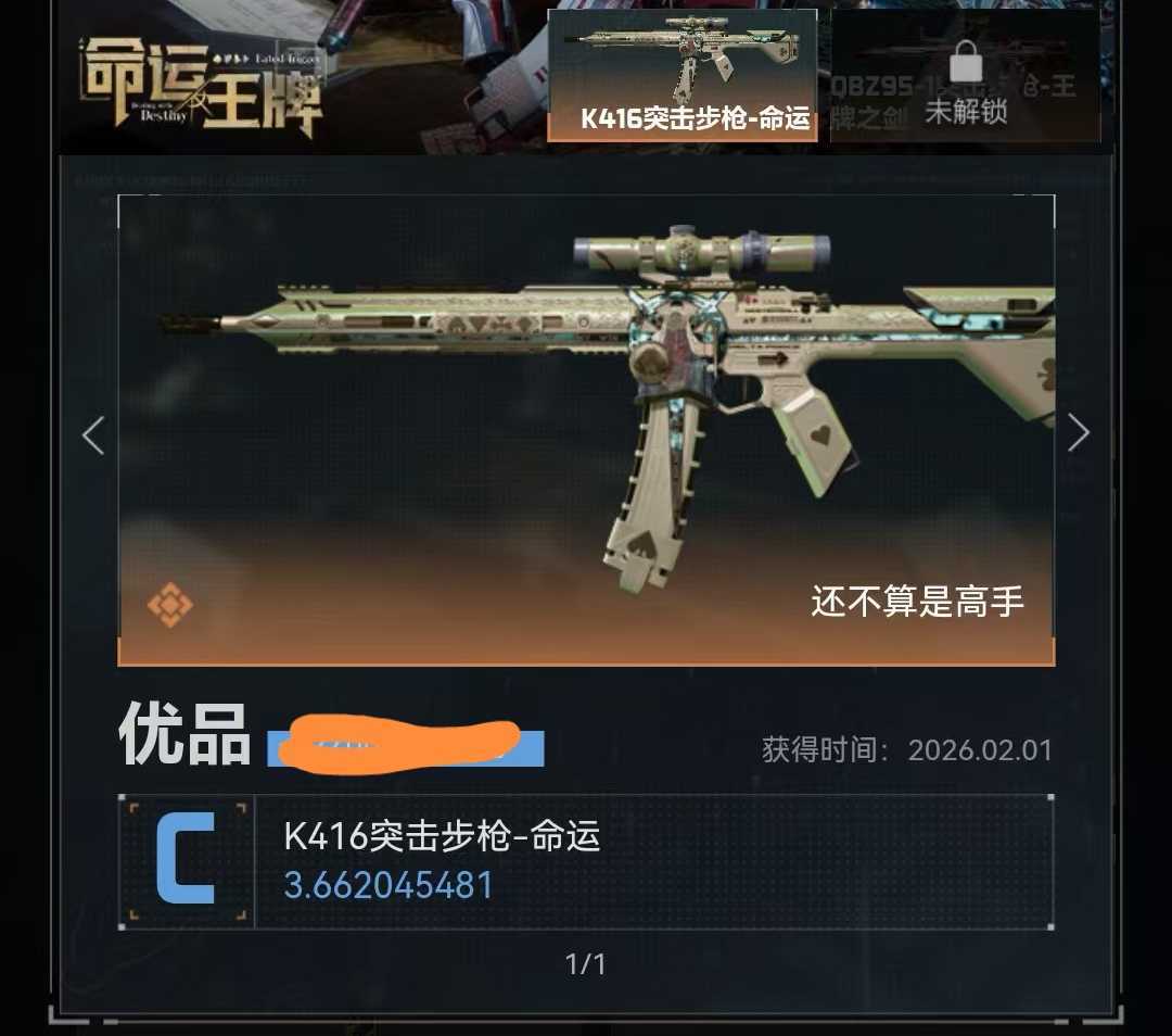装备描述:禁止开挂毁号!都能找到人! 维什戴尔❤露娜天际线❤蚀金玫瑰❤送葬人❤夜鹰❤红狼电锯❤深蓝❤露娜金牌射手 K416突击步枪-命运(优品C) 近战:黑海 仓库8训练7靶场6潜水1