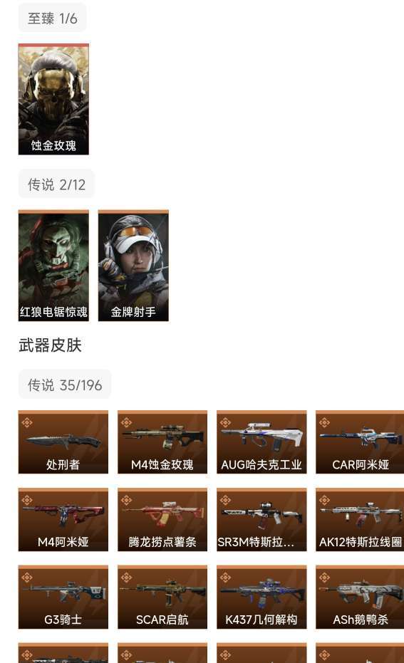 装备描述:蚀金玫瑰,红狼电锯惊魂,金牌射手,处刑者,34传说枪皮