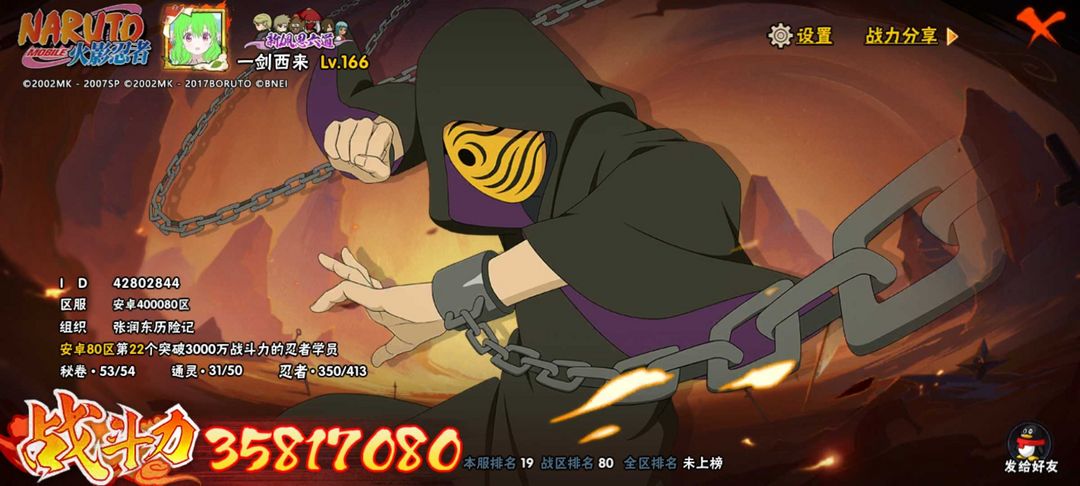 3500万战力,带戴帽虎皮,侠隐佐助带皮肤✨全高招全齐✨秽土再不斩✨53S✨