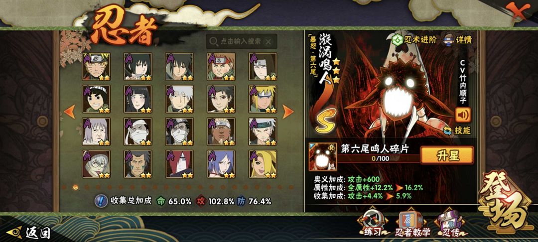 装备描述:六尾鸣人,丁真,漂泊带土,漂泊小南,漂泊再不斩,漂泊扉间,神农等众多s忍A忍