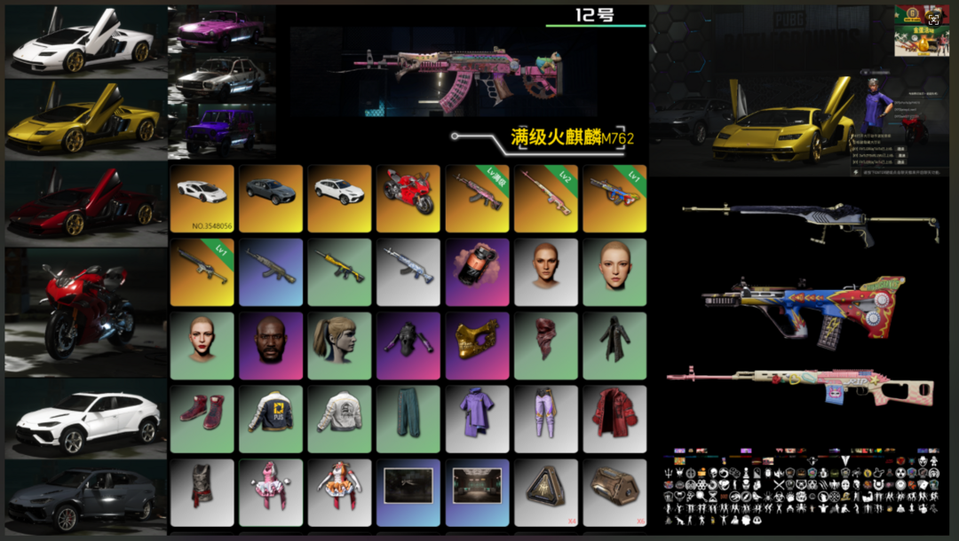 装备描述:---家里不要租 家里电脑玩不了--- 满兰博基尼/黄金烙车漆/杜卡迪/满级火麒麟/魔咒之力MK12/沙悟净MINI/爆裂AUG/粉梦德拉贡/彩色烟雾弹/黑鬼/萨芬裤/大金牙/发光套/悟空套/唐三藏套/绷带AKM/魔力甜心全套