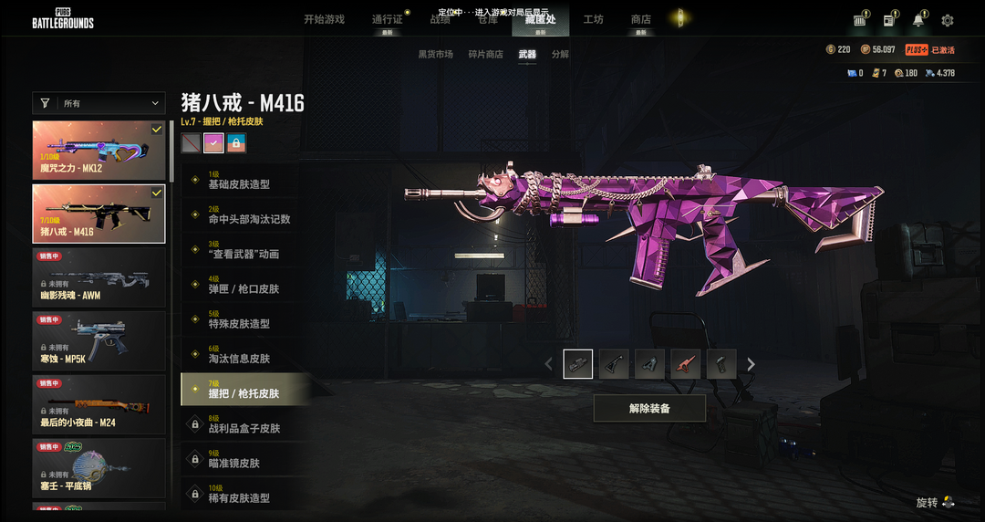 装备描述:二级密码686769兰博基尼SUV八级异色猪八戒M4美杜莎762三藏锅沙悟净迷你毒液762绷带AK