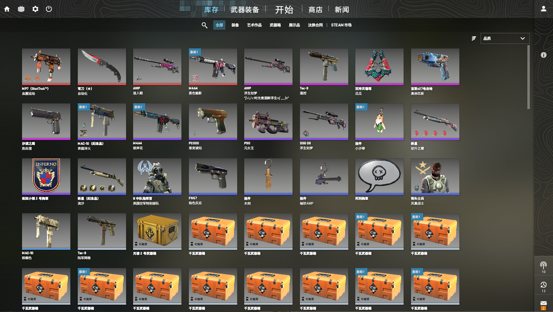 装备描述:5e完美新手丶弯刀自动化丶多红皮awp迷人眼丶m4黑色魅影丶mp7血腥运动丶苍蝇头探员丶多皮肤主战全