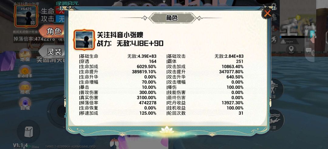无敌4E+90,可以打新图九阶轮回三十一次,可以打13阶仙蕴丹,四百七十万倍率,可以带小号修仙吃丹