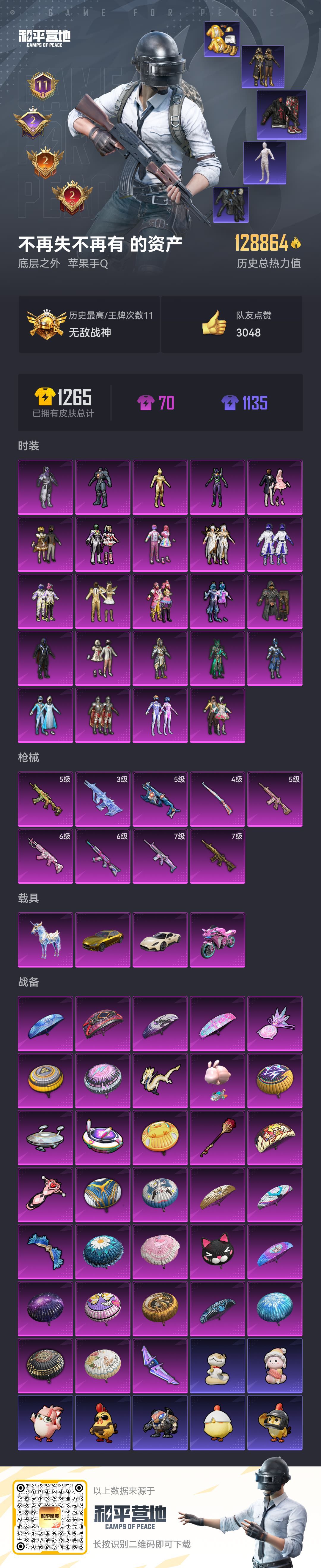 限制: 租号3次及以上 | 撤单率<50%才可租用此帐号装备描述:战神框 24粉-9枪-5载具 木乃伊 紫螳螂 雪国 都市赤蝎金鞋 黑丝 金迪迦 胖达圆圆 极限特训 红眼罩 恶魔人蛛 巧克力 深海小丑鱼 闪耀迪迦 胖达团团 新101 猪妹 萌熊背包 猫包 3级AUG星梦奇缘 M416-黄金龙骨 M416-星际漫游 7级五爪金龙 7级梦幻火箭 金玛莎 水晶马