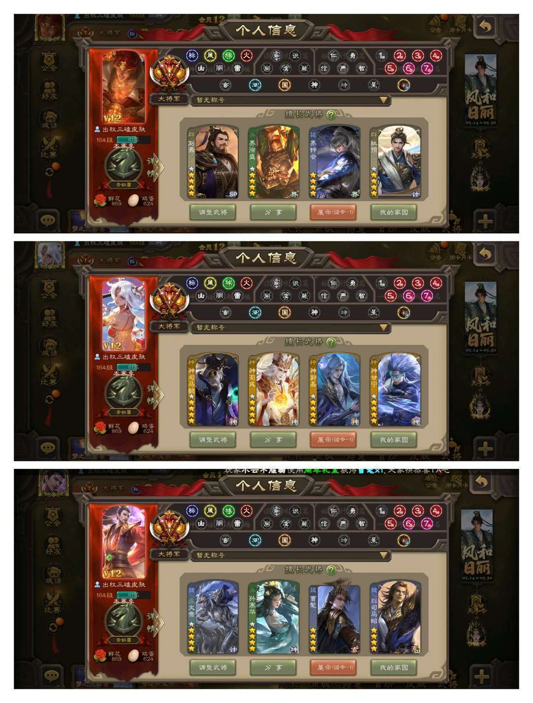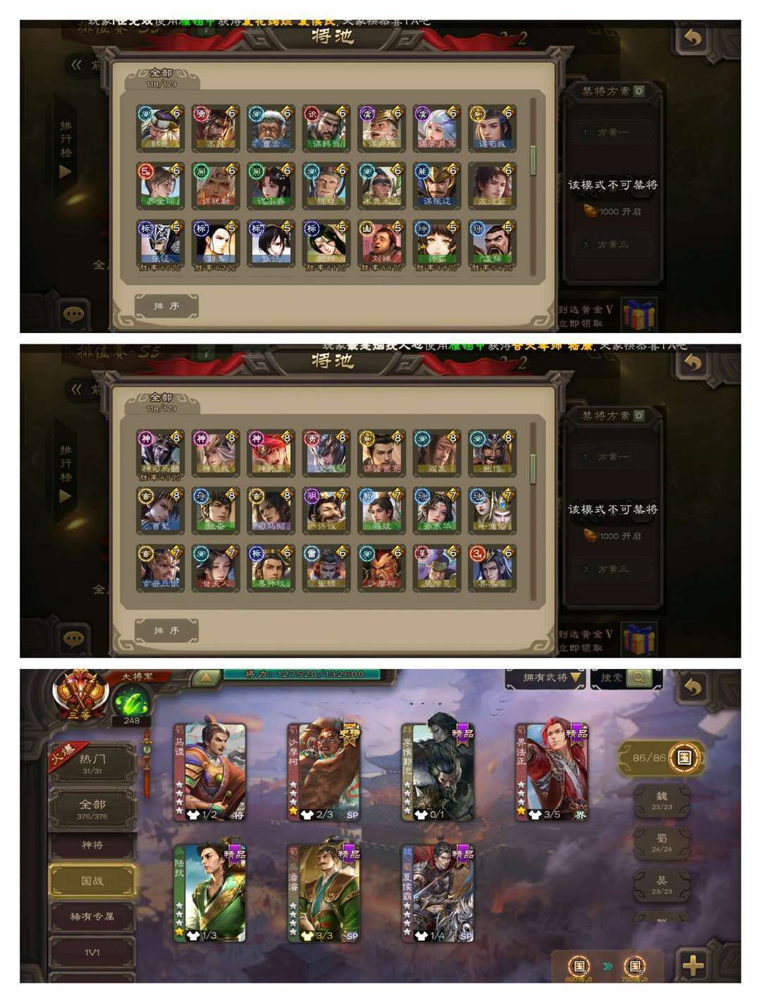 限制: 撤单率<19%才可租用此帐号装备描述:官方三等大将军,无卡,VIP12! 12四星玉龙:回廊双形态至臻动神郭嘉,回廊双形态至臻动杜预,回廊双形态至臻动界钟会,回廊动界徐盛,回廊动文鸯,奇门动孙寒华,动刘焉动司马昭动神荀彧动神甘宁动神司马懿,曹髦! 53史诗武将:奇门动花鬘,回廊动神孙策,回廊动聚义,回廊动王元姬,回廊动许攸,回廊动张星彩,动谋诸葛亮动星周不疑动神陆逊动神赵云,金骆驼,张奋十常侍张仲景谋曹仁曹婴,郑玄神吕布鲍信阎象谋黄月英曹嵩! 118排位武将88国战武将,42动皮110金皮180国战皮肤!