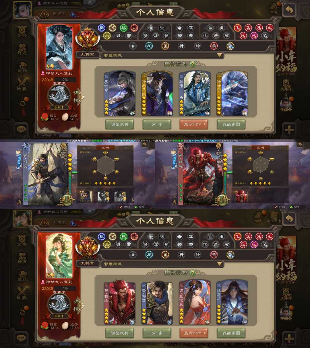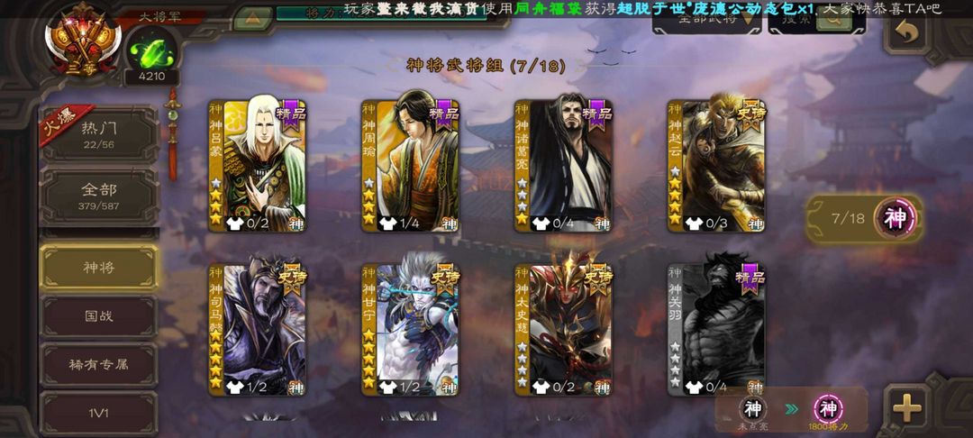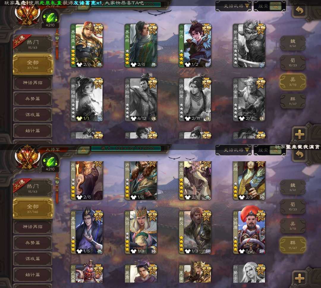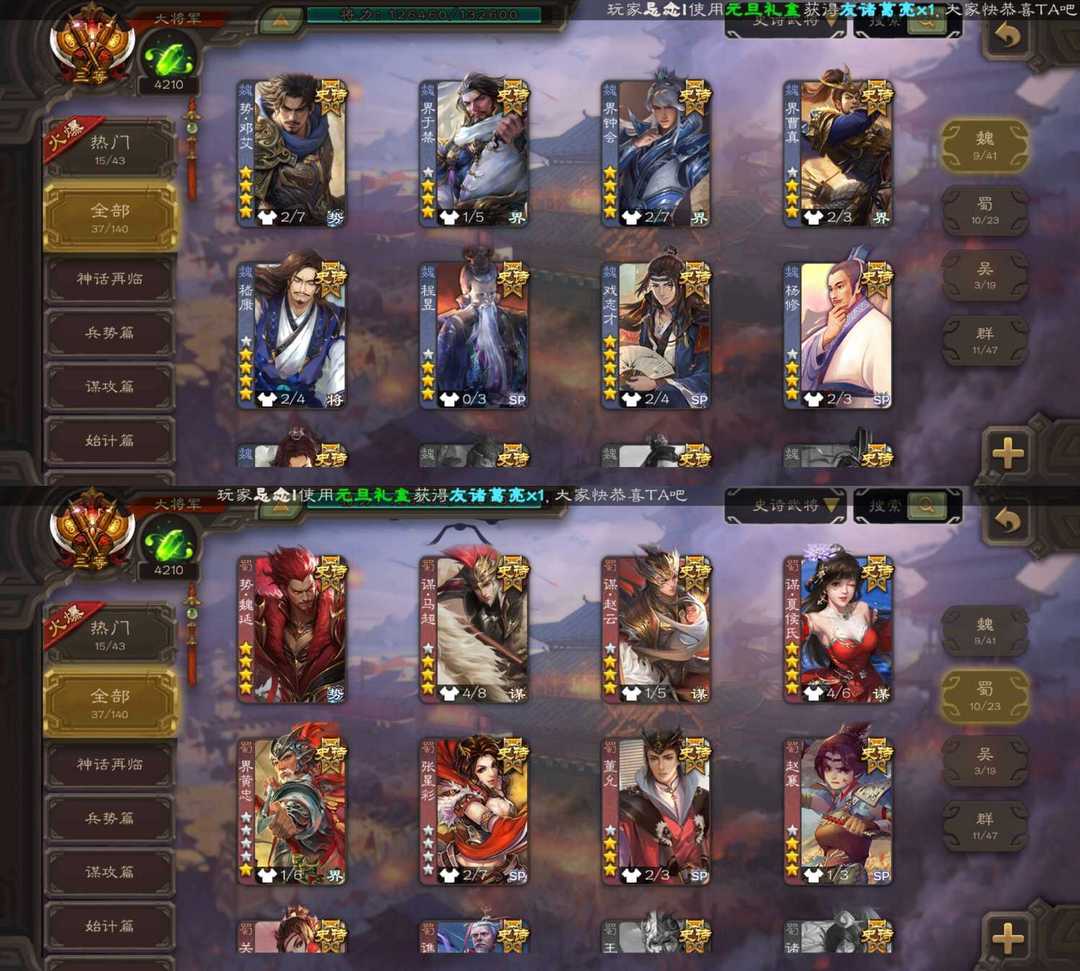 装备描述:大将军天王势邓艾/火龙果势魏延/军八七杀王动态神司马懿/动态神甘宁/潜蛟觊天双形态界钟会/动态嵇康/动态谋夏侯氏/裴秀/界徐盛/神太史慈等史诗