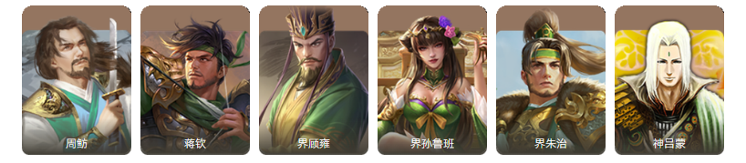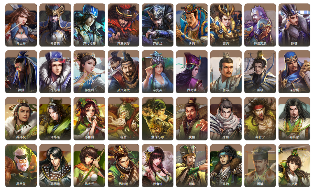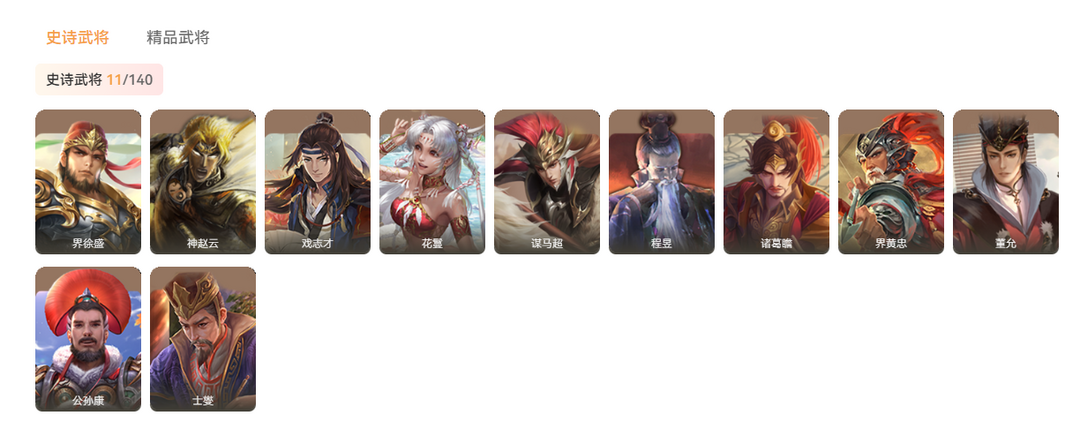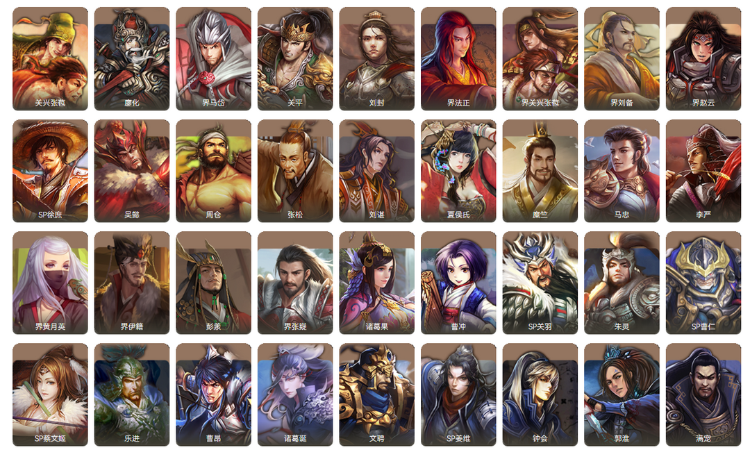 装备描述:魏史诗:势恒阶、戏志才、程昱、王凌、陈琳丨群史诗:公孙康、士燮丨神史诗:神赵云丨吴史诗:界徐盛丨蜀史诗:花鬘、谋马超、诸葛瞻、界黄忠、董允丨魏精品:王基、SP关羽、SP曹仁、SP蔡文姬、乐进、曹昂、诸葛诞、朱灵、文聘、SP姜维、钟会、曹冲、郭淮、满宠、界王异、界曹操、界司马懿、界夏侯惇、界张辽、李典、曹真、韩浩史涣、陈群、钟繇、司马朗、郭皇后、孙资刘放、辛宪英、界荀彧、张恭、崔琰、谋徐晃丨群精品:伏完、界袁术、张宝、伏皇后、李儒、华雄、袁术、界华佗、界吕布、公孙瓒、蔡夫人、公孙渊、张鲁、蹋顿、董白、刘虞、曹节、卢植、董承、界刘表、王濬、谋卢植、贾充、李傕郭汜丨神精品:神吕蒙丨吴精品:诸葛瑾、孙鲁育、程普、潘璋马忠、虞翻、朱然、界甘宁、界吕蒙、界黄盖、界周瑜、界大乔、界陆逊、孙鲁班、顾雍、朱治、界孙权、潘濬、孙亮、周鲂、蒋钦、界顾雍、界孙鲁班、界朱治丨蜀精品:夏侯霸、马良、关兴张苞、廖化、界马岱、关平、刘封、界法正、界关兴张苞、界刘备、界赵云、SP徐庶、吴懿、周仓、张松、刘谌、夏侯氏、糜竺、马忠、李严、界黄月英、界伊籍、邓芝、彭羕、界张嶷、诸葛果丨